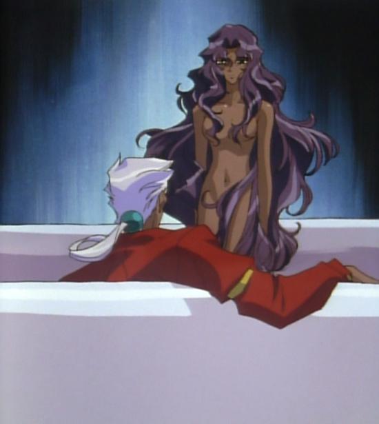 The series isn’t exactly subtle about driving home their sexual relationship; where we’re often left with brutal suggestion (Akio and Touga), here we actually see the act take place, and the show is peppered with before and after sequences, just in case you forget they’re screwing. It’s pure speculation how, why, and when this started; perhaps it was at first an innocent pursuit of closeness, or maybe Anthy initiated it out of love and desire for Dios, or perhaps Akio started it as an exercise in power over Anthy. However it started, it’s become the last example: as with Touga, he’s using a dominant position in a sexual relationship as an expression of his dominant position outside the bedroom as well. Anthy goes to him, instead of the other way around, but he always makes the initiating gesture, always beckoning her to him. Akio rarely undresses while she is always totally nude. There’s no question as to who is running the show.