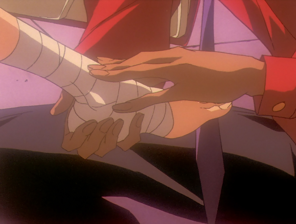 Then we go right back to where it all started. The symbolic sledgehammer: a man on one knee before a woman. An insanely powerful image, whether you identify it as love, sex, or submission. The theme for this one is love. Or at least it is to Utena, whose prince fixation quickly forces the crucial link between Akio’s position and a man proposing marriage. Only in that most basic sense does Akio fill this role out for her. While her mind registers what’s going on as romantic, and that is the overriding sentiment, Akio’s making it quite sexual and on a subconscious level, Utena realizes that. The scenario is romantic by design (omg weak vulnerable princess must be carried away!), but there’s nothing sweet and caring about the way Akio caresses her ankle. Or the way he wraps his hand around her heel to support the weight of her leg so it stays raised when he leans in, as opposed to letting it lower, which would have removed the sensation of her legs being held apart and allowed her to feel less vulnerable.