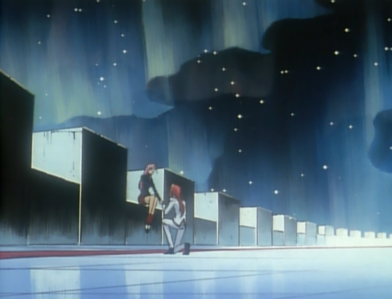 Speaking of Touga, he stands as the stark opposite of approach when it comes to personal space: not once does Akio move in on his personal space forcefully. We never even see him do it with consent. Though there's a very obvious sexual relationship between them, there remains a formal social distance kept between them when they're not having sex. You could attribute this to a difference the director felt was necessary in portraying male homosexual behavior, but more likely it's that that formal distance is there. Unlike Akio's other lovers, Touga doesn't get even the slightest illusion of intimacy; it's about power, it's about sex, that's it. The arrangement suits both of them just fine, they have sex when they want, but when they aren't doing that, there's no reason to maintain intimate closeness.