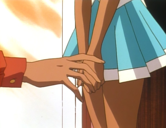 Akio will occasionally place his hands in his pockets or on his hips when he’s standing, and this behavior accounts for much of his auto-contact body language. Hands in his pockets are part of how he exaggerates the impression of casual relaxation he uses for Utena—when his hands are simply on his hips the suggestion is that Akio’s touching his genitals (left). Yes, body language is that blunt. This isn’t meant to indicate that he’s about to spontaneously start masturbating. The contact suggests a second party: the person watching. One well-known example of this sexual suggestion is a woman who will run her hand idly over her chest when talking to a man she’s attracted to—the implication is that of the man she’s speaking to touching her breasts.