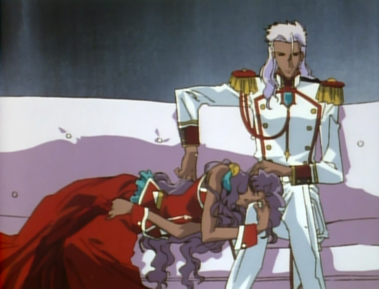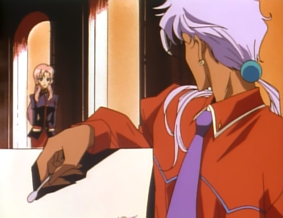Tense people have a habit of grabbing anything they attempt to pick up, as though they anticipate great weight or a struggle (see: Saionji). Akio’s not like this by nature, but there is the occasional exception. Namely, when he’s pissed off at Anthy. In these (rare) scenes, Akio grabs her tightly enough to fling her around. However, she doesn’t resist at all, so you end up wondering if Akio’s being as rough as it looks or if she’s exaggerating her reaction to rub it in his face that he’s resorting to physical hostility to keep her under control. I tend slightly to the latter, as it’s a very passive aggressive ‘Anthy’ thing to do.
