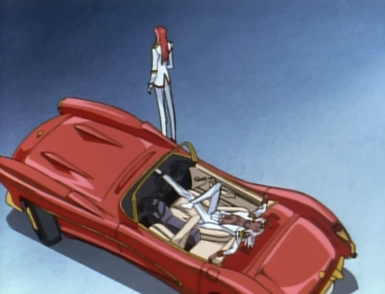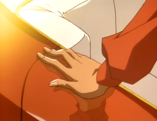This is not deliberate, but rather it's a natural trait he's seen using when there's no focus on him. When Utena and Wakaba are yapping in episode 30, during a pause in his role in events, Akio starts running his hand over his car. No one’s watching him; he just decides to occupy his time indulging his sense of touch. Go figure that Akio, whose purpose in life is making sure he doesn’t deal with the nasty ouchy pointy swords, would have an unusually strong appreciation for this particular sense. When he pulls his hand away, and we see another peculiarity of his.
