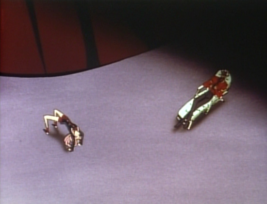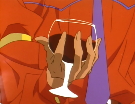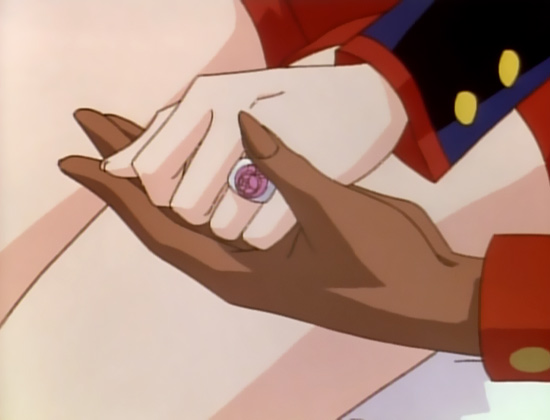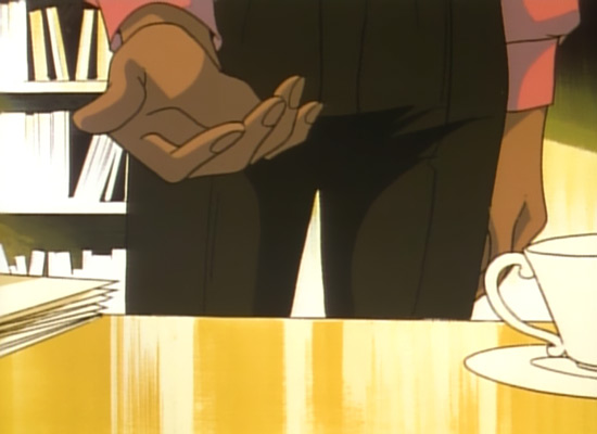 While the meaning of pocketed hands is typically negative, indicating deception, shyness, or detachment, people rarely interpret it that way. A gesture that indicates he’s being deceptive is interpreted by Utena as a sign that he’s a relaxed, confident guy. Akio is both, but not because his hands are in his pockets—his hands are in his pockets because he’s lying to her. Ironic, no? (Yes, Akio is relaxed, within the realm of what he feels he controls absolutely. Not so relaxed when Anthy’s subtly threatening him.)